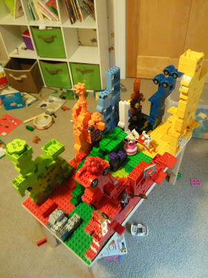 We didn't get all the Duplos on before lunch time and the youngest members of the activity were done with it. However, Joshua did better than I was expecting, only taking a few off. Once we got some windows on he played with those pretty well. Isaac didn't put a lot on, but did bring a lot over.